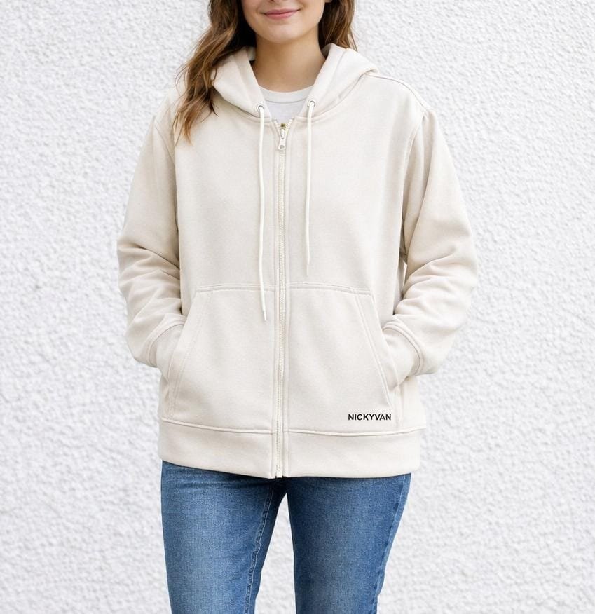 Buzo con bolsillos frontales, cremallera y capota.